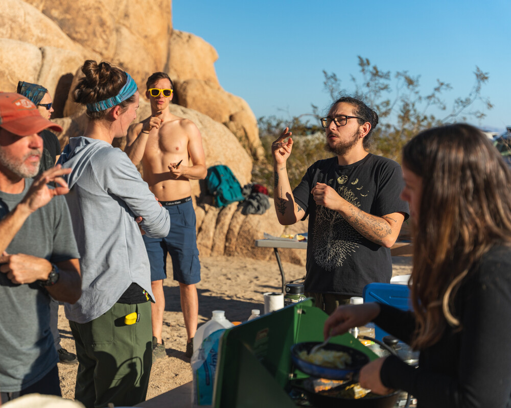 Die Outdoorwelt (auf persönlicher Ebene oder über das Internet) war für gehörlose und taubblinde Outdoorfans weder zugänglich noch inklusiv. Deshalb habe ich 2012 die Facebookgruppe ASL Climbing Network gegründet und mit Freunden regelmäßig Klettertage für Gehörlose in der lokalen Kletterhalle veranstaltet. Dann habe ich vom Red Rock Rendezvous erfahren, einem Outdoor Festival, das von Mountain Gear veranstaltet wurde. Ich war vorher noch nie auf so einem Festival gewesen, aber ich war neugierig. Gemeinsam mit den Veranstaltern habe ich Wege gesucht, um das Event so zugänglich und inklusiv wie möglich für mich zu machen. Später kamen noch mehr gehörlose Freunde dazu. Wir rekrutierten ganz wunderbare ASL-Dolmetscher (ASL = American Sign Language, dt. amerikanische Gebärdensprache). Die Gruppe wurde jedes Jahr größer. Auf einmal waren wir eine richtige gehörlose Outdoor-Community geworden! Als das Red Rock Rendezvous nicht mehr stattfand, sind wir nach Joshua Tree umgezogen. Einmal im Jahr veranstalten wir dort nun mit der Southern California Mountaineers Association das ASL Camp und Kletterwochenende. In diesem November jetzt schon zum vierten Mal.
